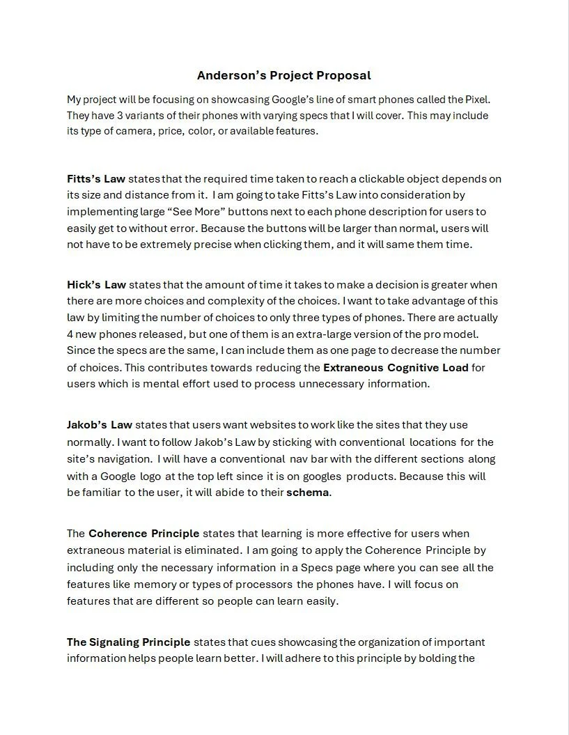 For the final prototype, I developed a website that allows users to easily compare the three different phone models by presenting key differences in a clear and concise way. The design supports quick and efficient navigation, enabling users to access detailed information quickly. Additionally, I highlighted the Pixel 9's innovative AI features, showcasing what makes them unique and allowing users to explore their benefits in an intuitive layout.