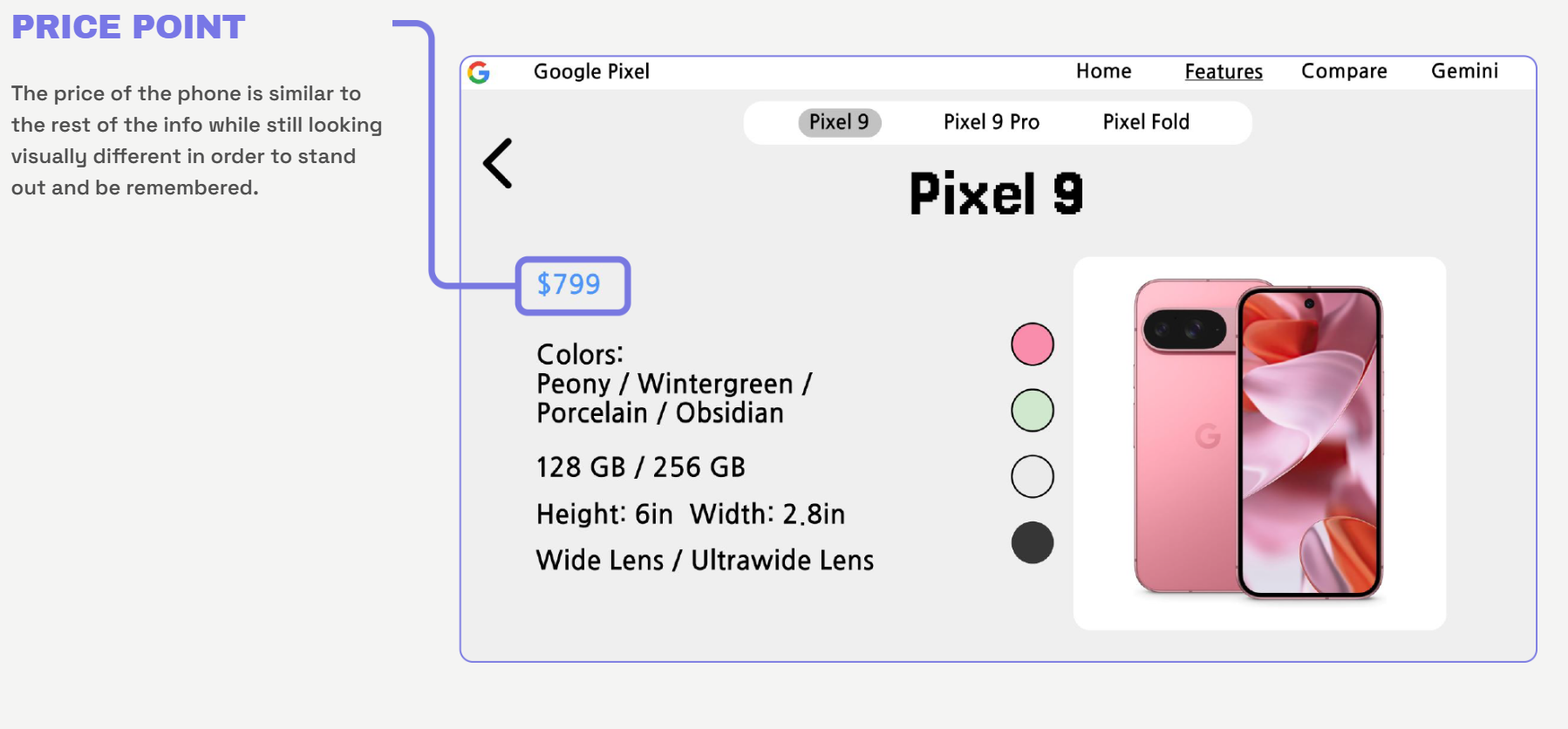 The goal of this project was to create a clear and intuitive interface that effectively communicates the differences between the three Pixel 9 phone models. The focus was on ensuring that users could easily navigate and understand the key features and distinctions between each model, providing a seamless and informative experience.